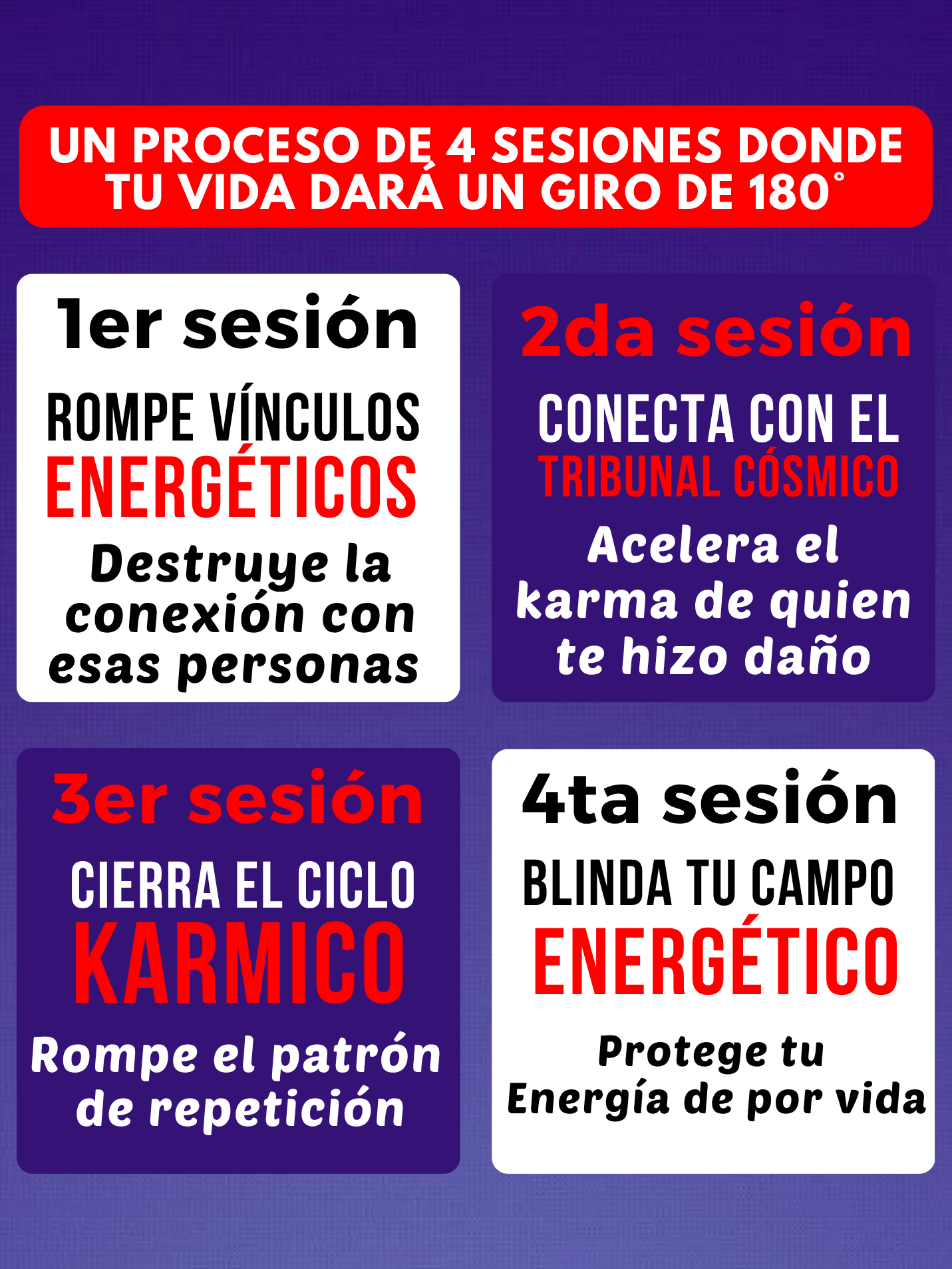 Libérate con un método probado de rituales y sanaciones energéticas que te devuelven tu fuerza vital, tu claridad y tu abundancia… sin depender de la suerte ni de esperar años a que el karma actúe.