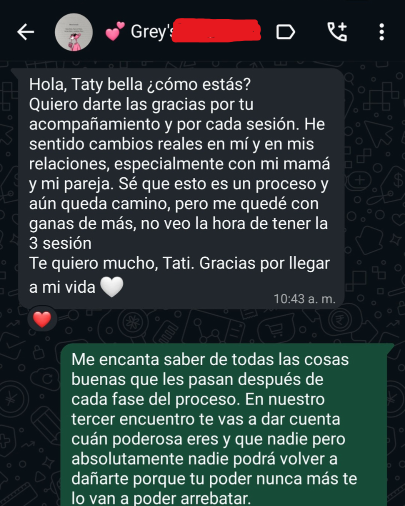 Una vez te pongas en contacto con Tatiana ella te enviará un link de pago y en cuento este se confirme se te libera la agenda y la información para prepararte para tu primera sesión o diagnóstico.